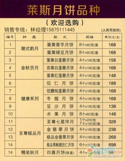 正文摘要:優(yōu)惠品種數量有限,售完即止 歡迎廣大朋友訂購,林小姐:15875111445(歡迎朋友們加微信好友了解更多萊斯月餅祥情) QQ:413778007(空間有相關價目表及品種介紹) 提前購買,折扣更低 |