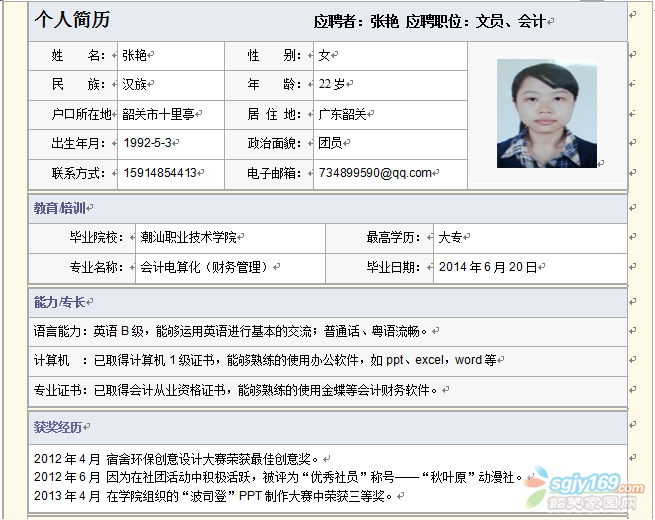 正文摘要:已經(jīng)取得會(huì)計(jì)從業(yè)資格證書,但是在從事會(huì)計(jì)工作方面的經(jīng)驗(yàn)暫無,之前2013年9月-2014年7月在韶關(guān)市同樂網(wǎng)游代練服務(wù)部從事過文員、銷售、客服的工作。我希望能找到符合專業(yè)的工作,希望能有培訓(xùn)的機(jī)會(huì)。希望工作有國 ... |